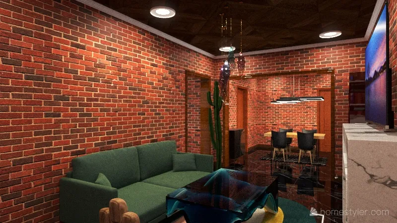 This design is for college kids and young adults; find a roommate or friend, get together, split the rent, get the groceries, and settle into this modern brick, spacious 2 bedroom apartment. Luxurious black marble floors, stainless steel appliances, marble countertops, wooden ceilings, what's not to love? Wide view windows that stretch from wall to wall. Double vanity, and a fitted tub set into Carrara marble, with a showerhead, the bathroom has all the necessities. Spacious rooms include a living room, a dining room, a kitchen, a bathroom, and two oversized bedrooms.