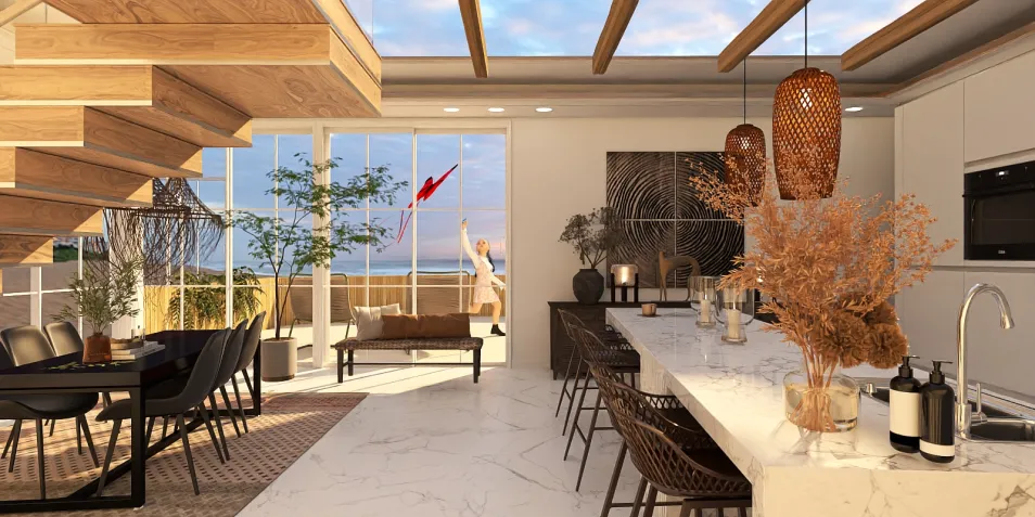 Mixing light and dark wooden tones on a white canvas. Light floods this family orientated dining/kitchen with ocean view.🌊