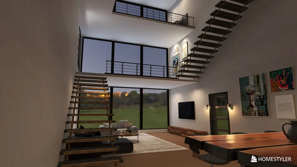 This Loft is 3 stories, and is equipped with a living room. kitchen/dining room, 2nd story balcony, 3rd story balcony, bathroom, and bedroom.