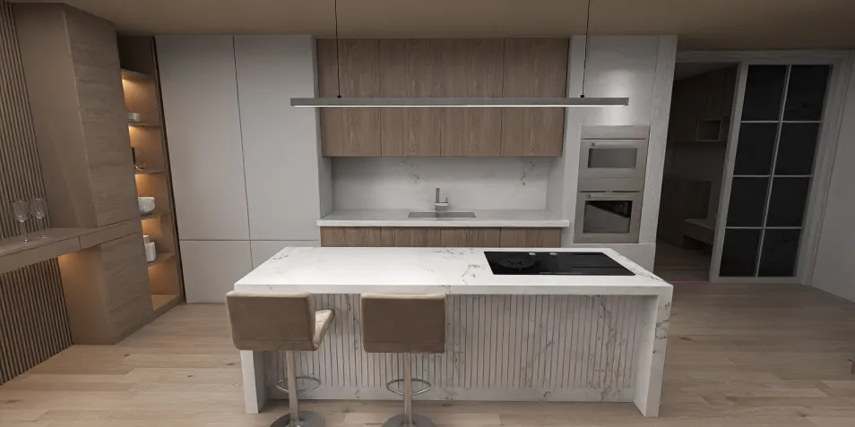 A sleek, sunlit space where minimalism meets warmth. The inviting round table, surrounded by plush chairs, beckons shared moments. Textured walls whisper stories, while the kitchen's marble counters gleam with possibilities—an everyday elegance that feels effortlessly luxurious.