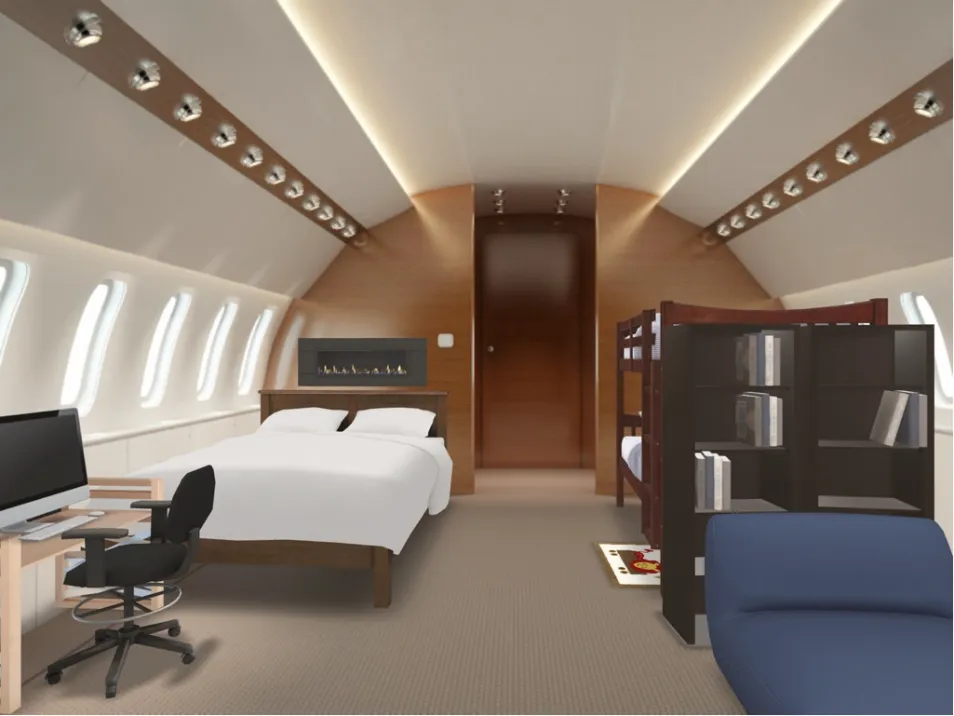 This bedroom, in the shape of a plane is home to a pilot and his family. This room has a bed for the pilot and his wife, a bunk bed for his kids and a small reading nook, as well as a desk.