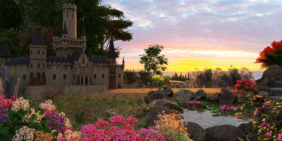 As the sun dips below the horizon, the castle stands majestically, cloaked in the hues of twilight. Flowers bloom vibrantly around the pond, whispering secrets of the day’s end, while the gentle rustle of leaves sings a soft lullaby to the encroaching night.