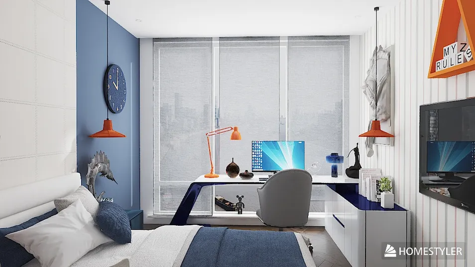 This bright room radiates energy and positivity, perfectly tailored for young teens. Fresh colors and playful designs create an inviting atmosphere, inspiring creativity and joy. Every detail, from the orange accents to the sleek desk, encourages a lively and dynamic environment.