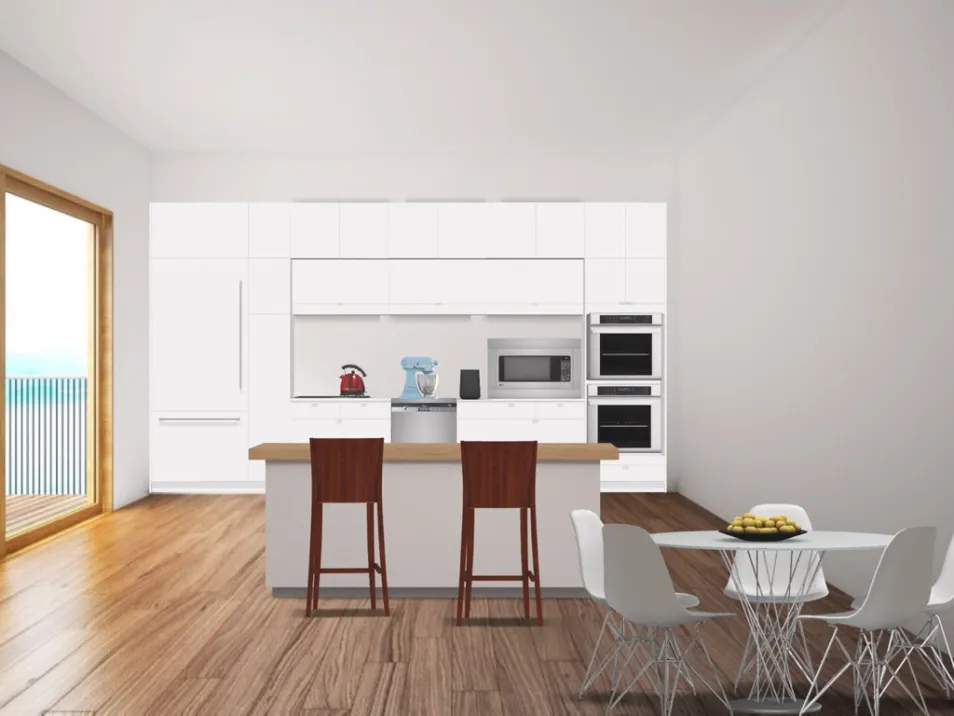 This is the second part of the aesthetic apartment. It is a modern kitchen with an island and dining table.