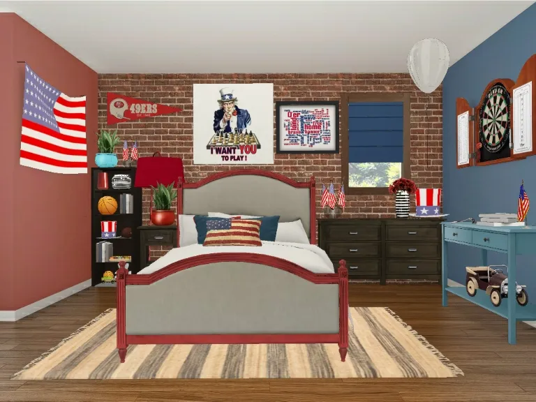 The boy who owns this room is an American football fan. As you can see, he has a 49ers banner in the top left corner of his bedroom. This boy is also clearly a fan of Uncle Sam, for he has two of his hats and a large poster of him above his bed.