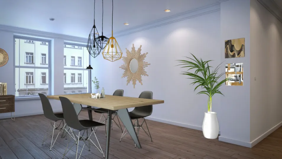 apartment dining room with black white and gold decor and wooden furniture
