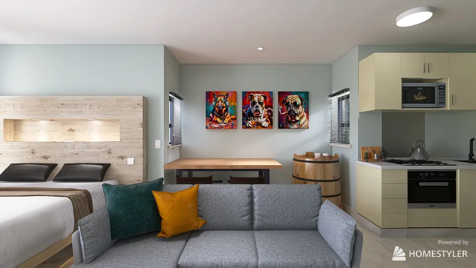 This design is for my brother. He has bought himself an apartment and I wanted to show him how he can design it. The dinning table, the wine barrel an old record player (used as a console table) he bought from one of the local auctioneers. I wanted to design a space that is masculine yet has a clean feel to it. The headboard, he designed himself, it has two downlights, two plug points on the shelf and two light switches - one on each side. feel the artwork I made works well in the design and portray my brother's personality.