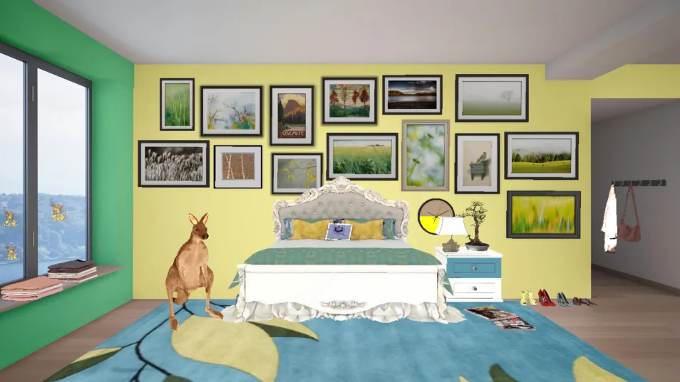 This design is based off Australia. I used gold and green which are Australia colors. I put photos of nature on the wall to repersent this persons love of nature. You can also see through the window what is happening to Australia's forests.