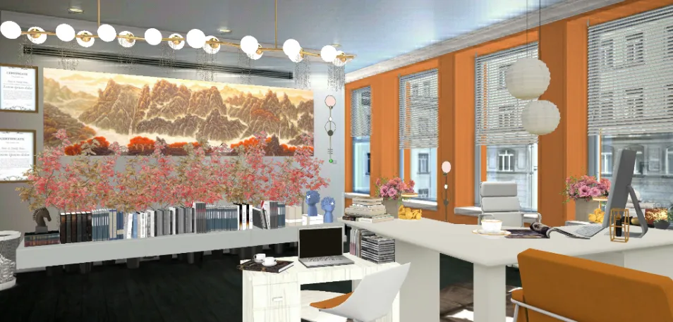 Orange represents enthusiasm and vigor. This is the office of a publishing company manager and her assistant. Books can be seen everywhere complemented by the energetic orange motif