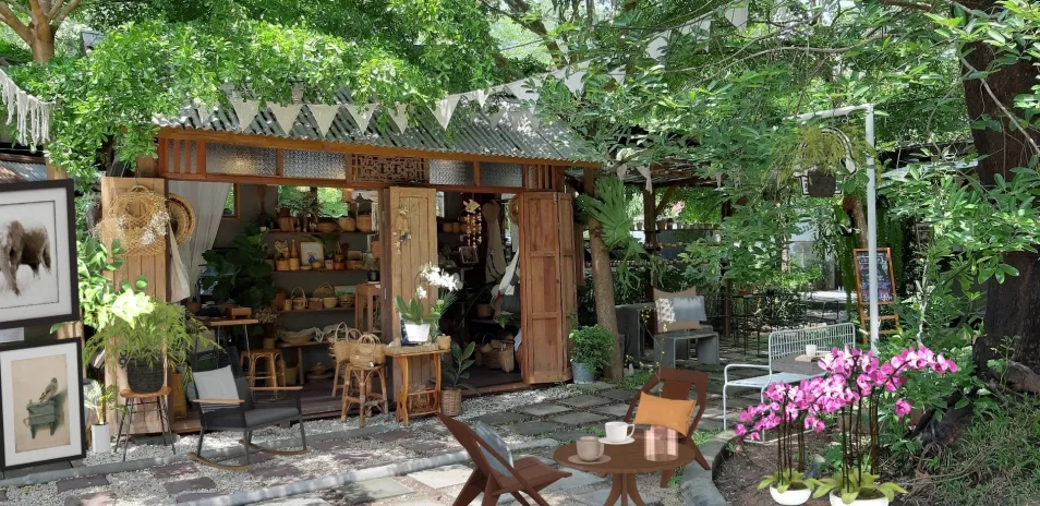 flowers and table set from homestyler makes it a lively sitting corner for a wooden shop.🤗