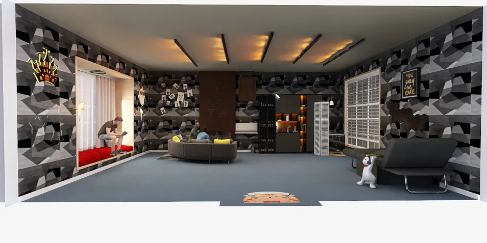 A cabinet for 🍻 and other things with a sink for the used glasses. Window platform seating, Quarter size sofa near the fire and sleeping sofa in the corner.