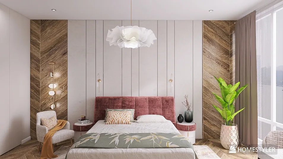 В этой спальне царит гармония текстур: мягкий бархат кровати контрастирует с теплом дерева на стенах. Легкий светильник словно парит в воздухе, а зелень растения добавляет свежести. Здесь каждый элемент говорит о комфорте и утонченности, словно шепчет: "Забудь о мире за пределами".