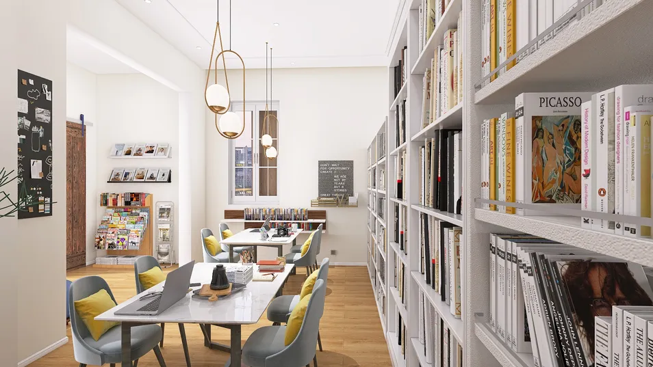 Diseño biblioteca para una residencia de estudiantes universitarios. Con 3 salas que destacan por sus funcionalidades: la ¨Brainstorming Room¨, con una mesa para más integrantes y perfecta para trabajo en grupo; la ¨Relax Room¨, un espacio acristalado para descansar, leer o usar tablets con acceso a juegos educativos y libros digitales; y la ¨Mute Room¨, completamente insonorizada diseñada para la máxima concentración, con escritorios individuales y equipamiento completo. El interior incluye mesas para cuatro personas, con iluminación suspendida, cabinas aisladas para concentración personalizada y un baño con área de revistas y descanso. La biblioteca alberga 7.000 libros, promoviendo un entorno ideal para el estudio y la investigación. En el exterior, zonas verdes, sillones, bancos y un pequeño oasis con mesas altas y taburetes invitan a relajarse o trabajar al aire libre. Máquinas expendedoras de snacks, bebidas y comida preparada completan un espacio funcional para cualquier necesidad.