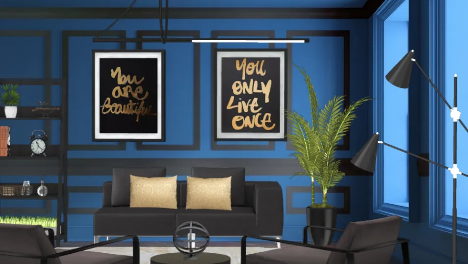 As cores azul e preto são os escolhidas para serem as predominantes da sala, com um pequeno destaque de dourado nas almofadas e na escrita dos quadros.