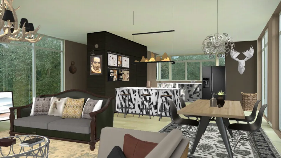 Sherwin Williams Black Fox, 7020 Sherwin Williams Warm Stone, 7032 Living room, dining room, and kitchen