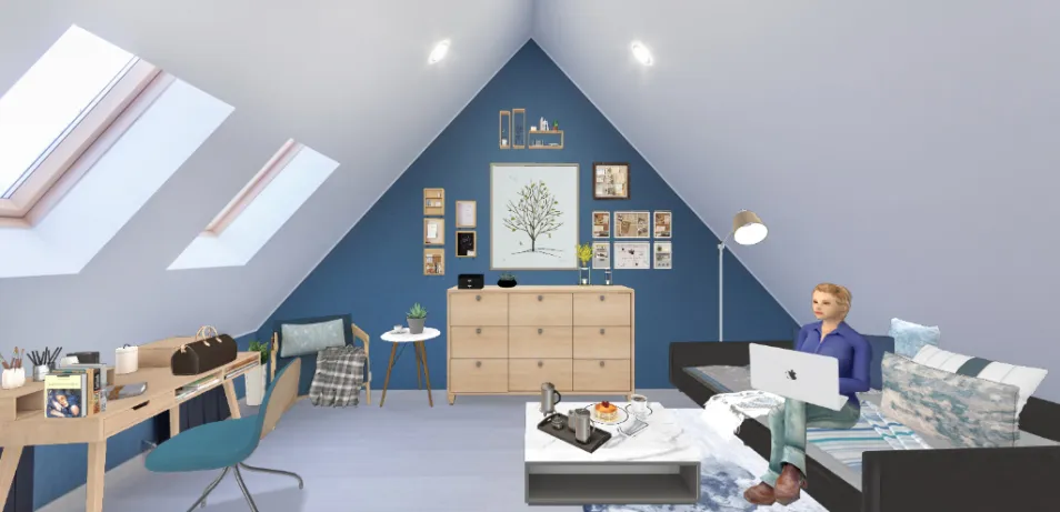 Created a blue modern room with a touch of black and white grayish colors.