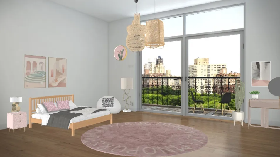 This is a cozy apartment bedroom right by the city it has a more boho style with the fun colors and designs but still kept pretty minimalistic.