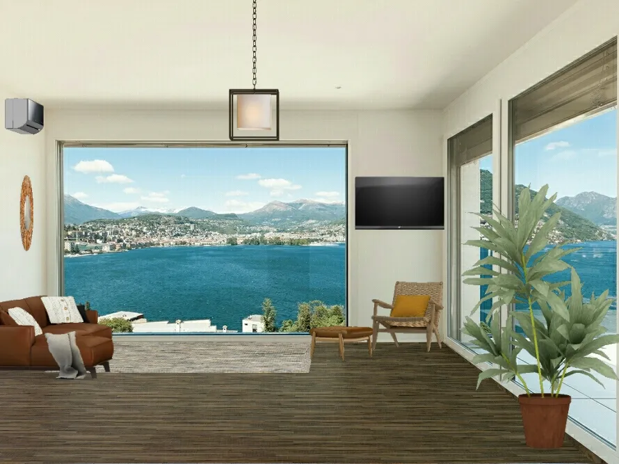 leather and leaves, wood and rustic vibes. a light, simple living room with a great view. could also be used as a kids room or adult resort