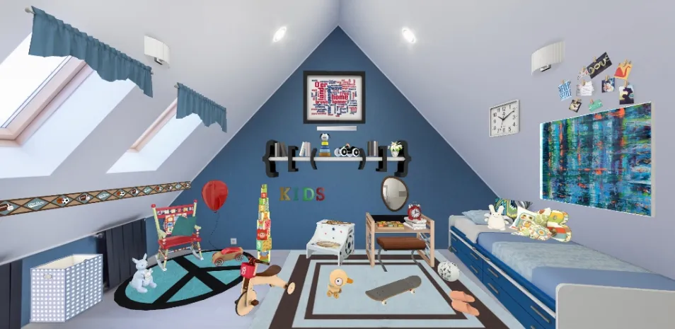Modern bedroom for boys, it's full of toys and I decided it would be mainly blue because boys (especially kids) really like the blue colour... Plus, it's not only blue it's somehow colourful 😉 Do u like it???