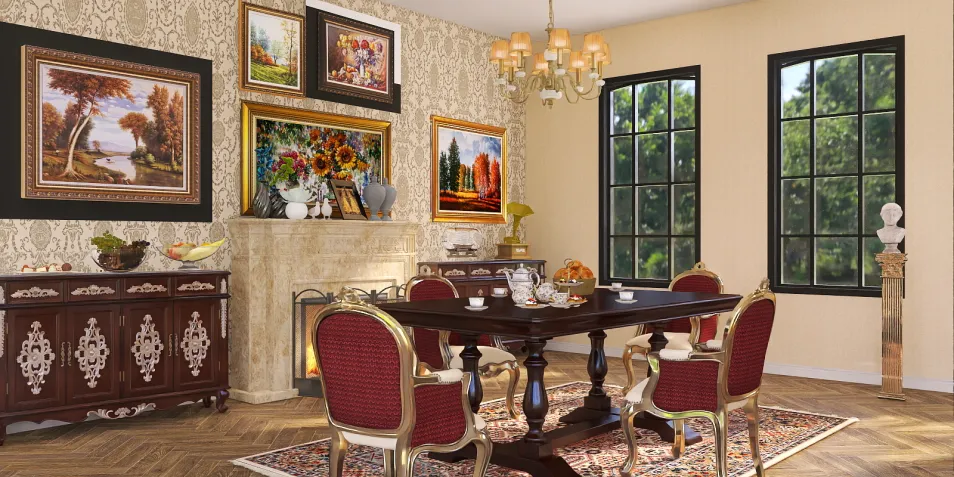 A breakfast room in a traditional upscale home. There's a glitch with the wall art frames. The black edges are not supposed to be there 😣