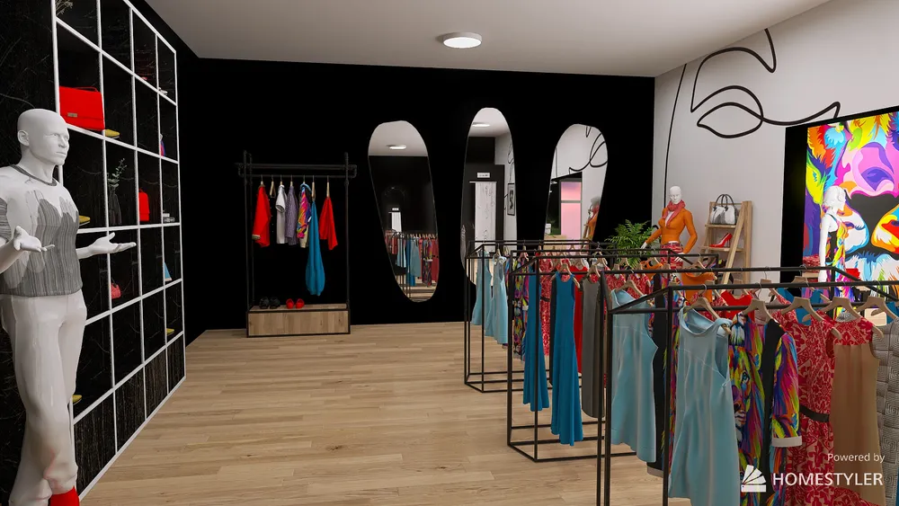 The bright colors just make the room pop with fun! displays of clothes, creatively arranged make it easy to find what you need. two cash registers are ready for you! you can even try your clothes on in one of the four dressing rooms.