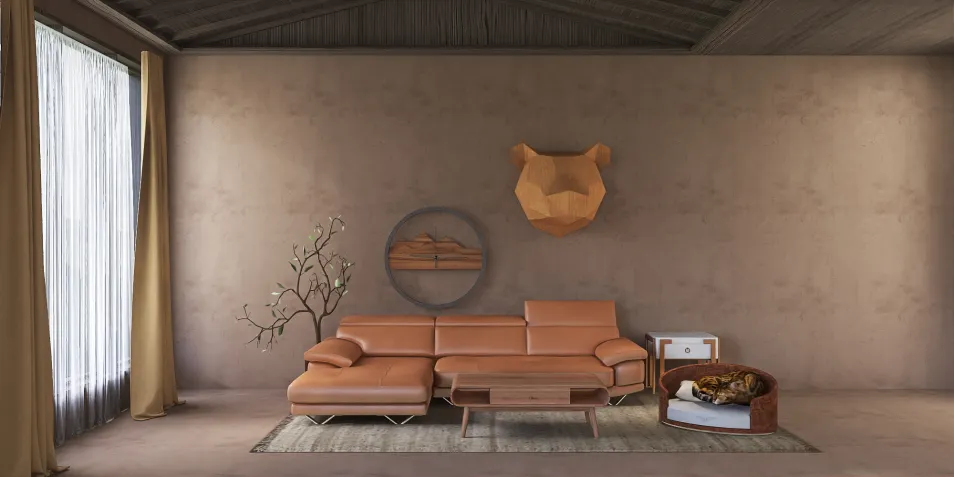 Brown living room that includes a couch, coffee table, pet bed with pet in it, side table, plant, bear sculpted in wood, and wooden clock.