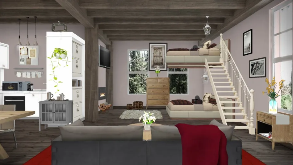 small cabin with kitchen, living room, and two queen sized beds. perfect escape for friends and family with plenty of room and storage!