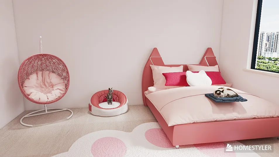 This is a girl's bedroom...but not just any girl! A Cat Girl! She loves cats so much that her bedroom reflects it! She has a beautiful big bed with her cat peacefully sleeping on the edge of it, a fun cat tree for her cats to play on, a cat-shaped bed and wardrobe, a chair for herself and her cat, a soft rug, and a cat-shaped light on her ceiling!