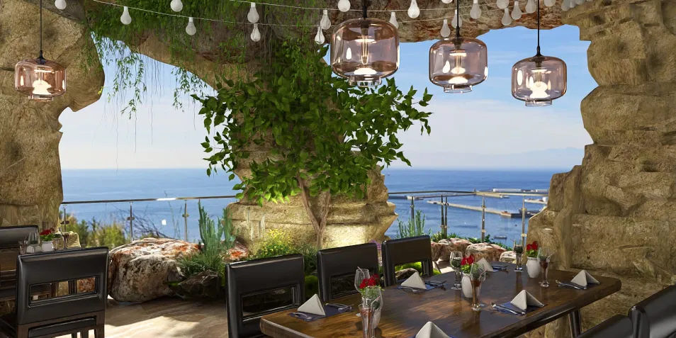 In this cavernous sanctuary, where the whispers of the sea entwine with the scent of wilted roses, one can't help but ponder: are we dining in nature's embrace or merely a gilded cage, adorned with glass and shadow?