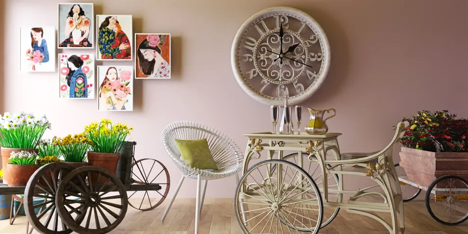 The room whispers tales of a gentle spring, where vibrant blooms and artful portraits dance in soft light. A clock, grand yet whimsical, ticks away moments, while a vintage cart cradles nature's beauty, inviting one to linger and sip life’s sweet elixirs.