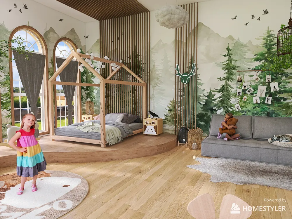 children's room in a forest deco style for a natural spirit in the depths of the woods. cabin bed, panoramic forest, nature decoration, deer shelves. Outdoor winter garden. Natural bathroom and large dressing room.