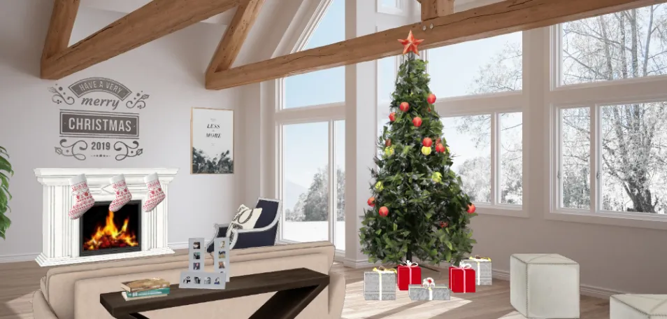 It was a snowy day, the children were sledding and the parents were wrapping presents, all was still and quite although it was very busy the house still looked great. The golden tanned wood is accented all throughout the room as well as the red Christmas colors get accented. the navy blue chair looks rustic which makes it look really good with the wood and the blue also brings some contrast. It is also a very sleek and clean design.