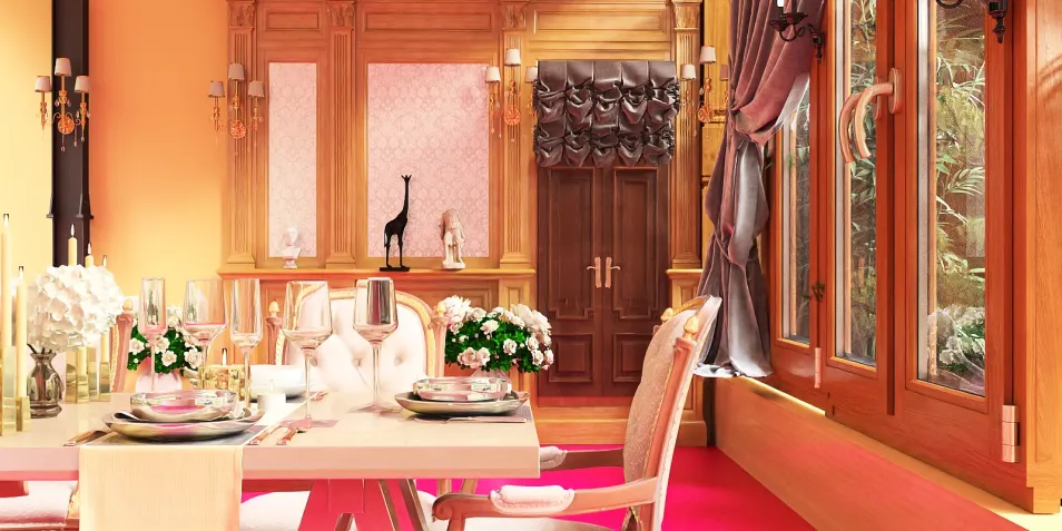 clasic dinning room in duke house or in some castle which loves to also see the backyard
