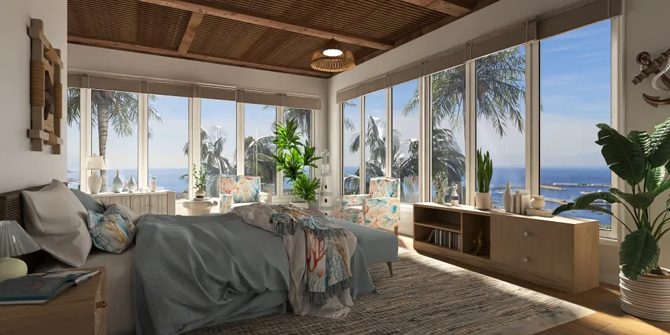 With a seaside view that dances in sunlight, this coastal room invites tranquility. Soft blues and sandy tones mimic the shore, while palm fronds whisper secrets of the ocean. Every detail, from the woven textures to the gentle breeze, echoes a harmonious escape into nature's embrace.