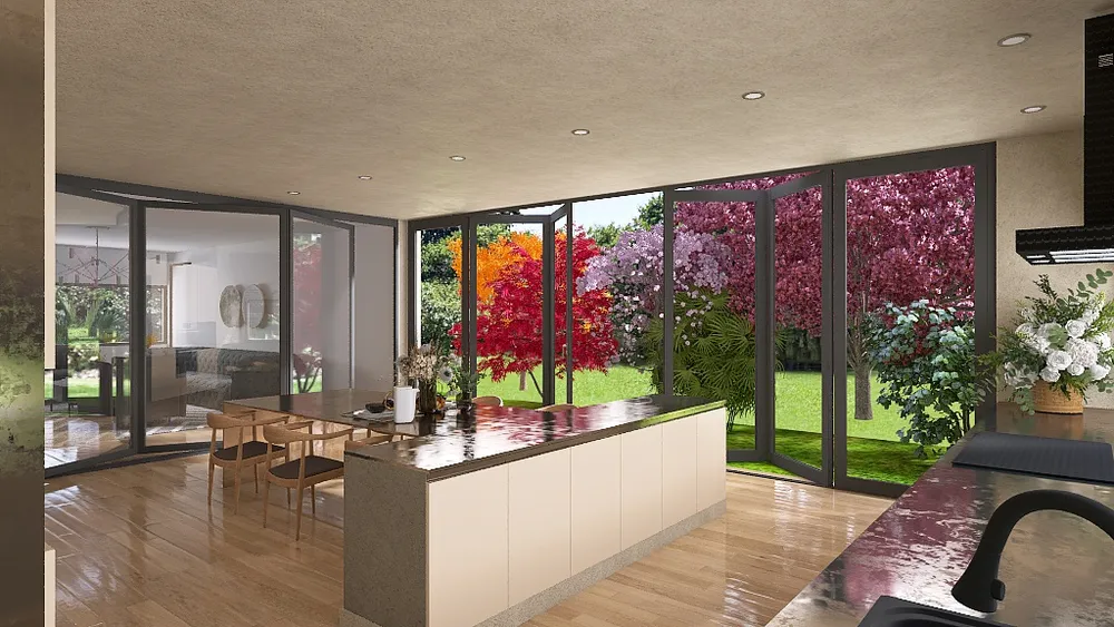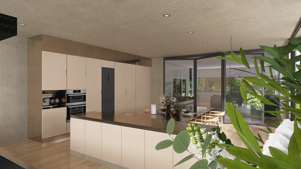 Es una cocina donde la naturaleza entra a la casa, con materiales naturales con la madera, los brillos del bronce y las texturas de la piedra, la luz se cuela por sus amplios ventanales donde la naturaleza hace su presencia, es grande y espaciosa para poder comer en familia y hace de continuidad con el salón para que se pueda extender y convertir en una sola estancia si se desea, funcional, luminosa y con diseño.