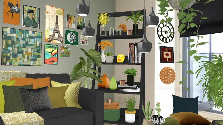 A small city livingroom, crammed with art and bursting with color, with black furnishings to accent it all.