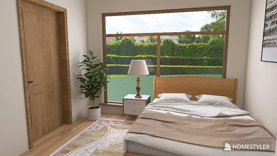 In this serene bedroom, sunlight bathes the wooden furniture, while a gentle breeze whispers through the open window. A single plant stands, reminding us that nature thrives even in our most intimate spaces.