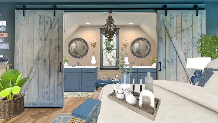 A charming, country style bedroom and bathroom at a B&B off the beaten path. in beautiful blue tones with weathered woods and soft fabrics.