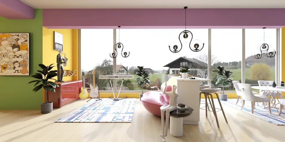 This is an interesting color decor, and country scenery from the windows made it fun to give a theme/ furniture selection. I went with a more art/music base theme and used bright colored furniture with art deco design. I kept the dining table modern, bright carpeting and some greenery to finish the design