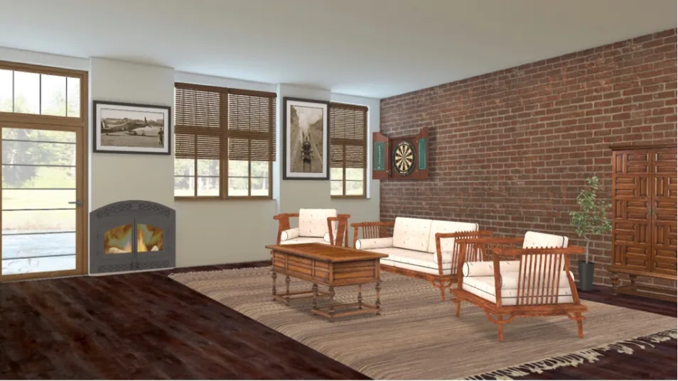 Old wooden furniture. Ugly brown rug. Tree to keep inside the house. A dart board for the old men to play with. And a fireplace. I left the walls but changed the floor boards to a dark brown colour. Two pictures, one of a train and one of a old plane. Both pictures are in black and white. I also put brown curtains.
