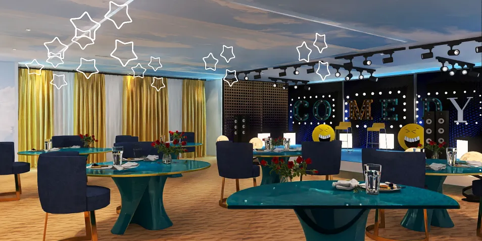 Stage set ! lights on! let the laughter begin 🤭. Couple date night with the theme "feel nature" . blue sky ceilings and soft beach sand floor set to have that outdoor feel while enjoying a cozy evening ❤️ filled with heartwarming laughter.