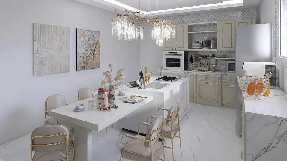 Cliente: Márcia T. Idade: 60 anos; Cozinha moderna com armários clássicos; Preferências: cores claras;