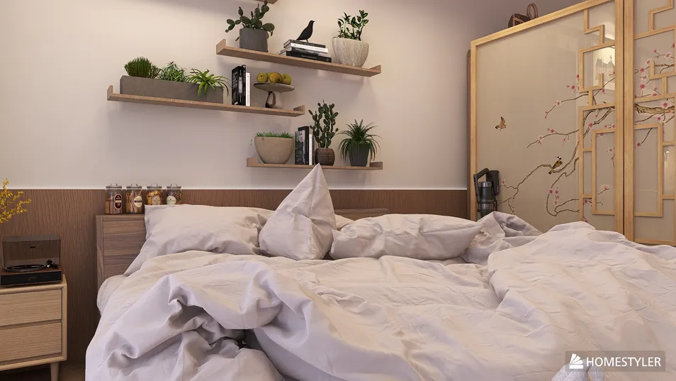 Picture a cozy bedroom with a warm, inviting atmosphere. A plush bed with earthy-toned throws sits near a large window showcasing the glittering city skyline. Soft lighting and sheer curtains create a serene ambiance, while a snug armchair in the corner offers the perfect spot to unwind. Its simple, but very dreamy! 🌻
