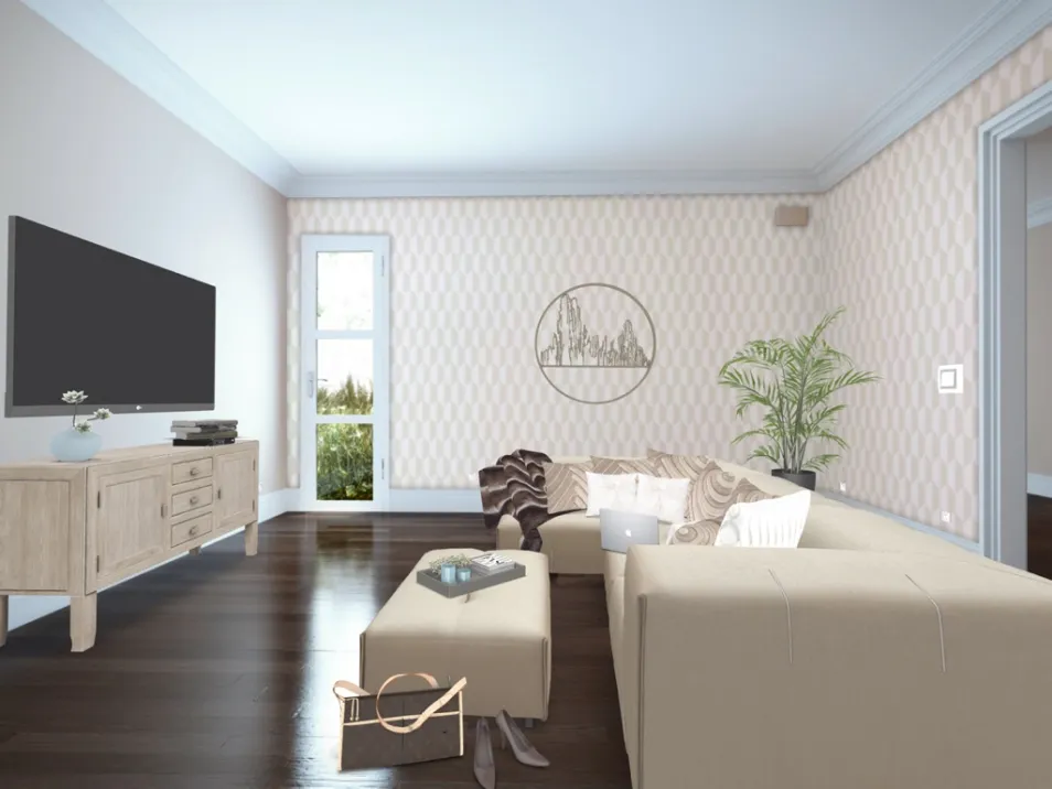for this design I was going for a light room, but then I realized I wanted to keep the dark tones of the floor, while keeping the true color of the room, and mixing it with a matching wallpaper. this is a cozy living room