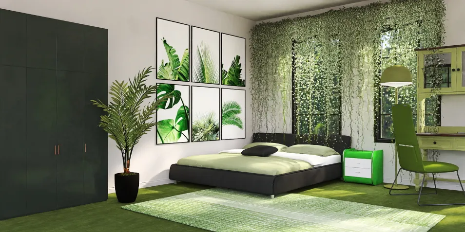 This is a dark green bedroom. Cute bedroom and lots of plants. Running out of colour ideas so if any ideas, comment what colour u might want.