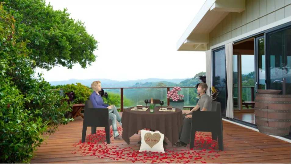 To people sitting at the table who are MADLY IN LOVE 😍😍😍😍😍😍😍😍💋💋💋💋💋💋💋💋💋💋💋. On the left you can see a wine maker thing. On the table they are drinking champagne 🥂 and eating chocolate cake. Red rose petals surrounding them.