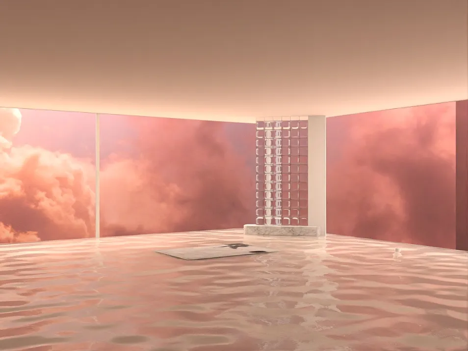 在这个如梦似幻的空间里,透明的墙面映照出粉红色的云朵,水面轻轻荡漾。中央的雕塑宛如悬浮的幻影,仿佛时间在这里凝固,现实与幻想交错,令人沉醉。
