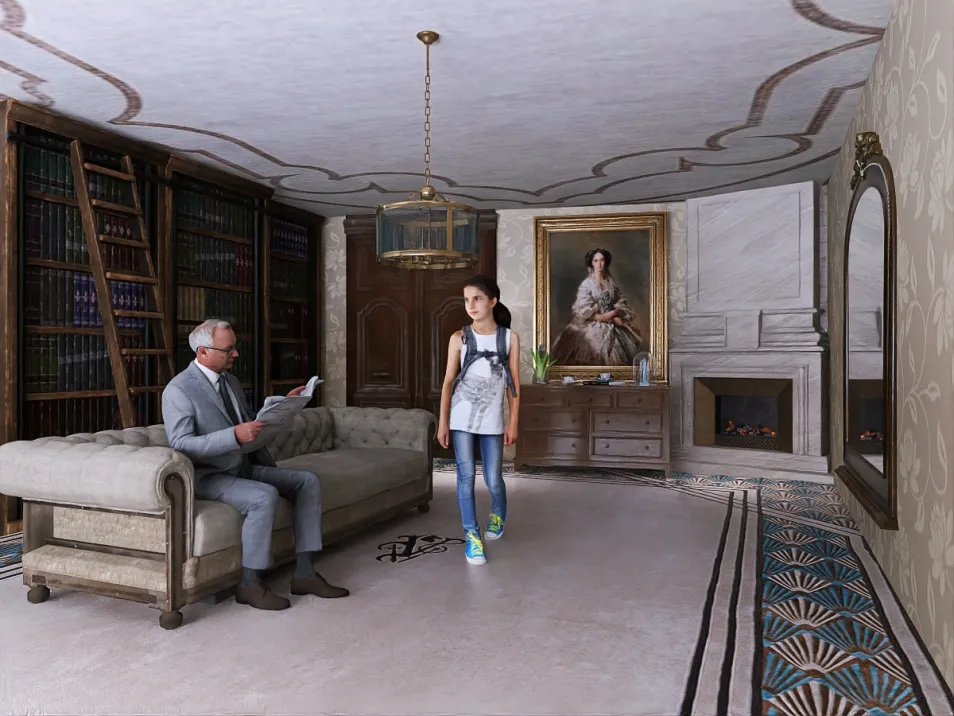 1/3 Henry: This is our library. I think You'll find something interesting here. Just look closely. Victoria: You keep saying "we" and "our". So there is someone else here too. Why can't you just tell me? Henry: You will find that out soon, just be patient. Victoria: So you still want to keep your mysteries.. Okay, let's have a look at this bookself then. 2/3 Victoria: There's a book missing here. Maybe my storybook will fit here. Let's try.... Something's moving.. The wall is sliding away! 3/3 Victoria: There's an identical room behind the wall. Very interesting. So that other door is leading somewhere. Henry: Why don't you go and have a look. Victoria: Don't mind if I do, thank you very much.