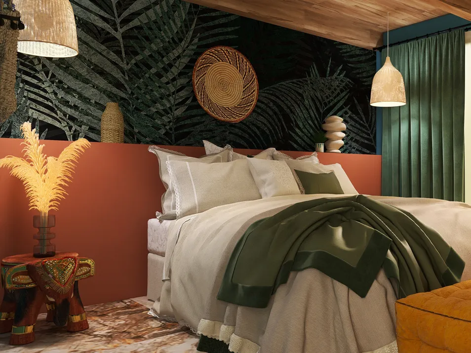 Эта спальня словно окутана тропическим дыханием. Яркие акценты и натуральные текстуры создают атмосферу отдыха. Легкий шелест листвы и мягкий свет плетеных светильников наполняют пространство спокойствием и гармонией. Здесь каждый элемент говорит о природе.