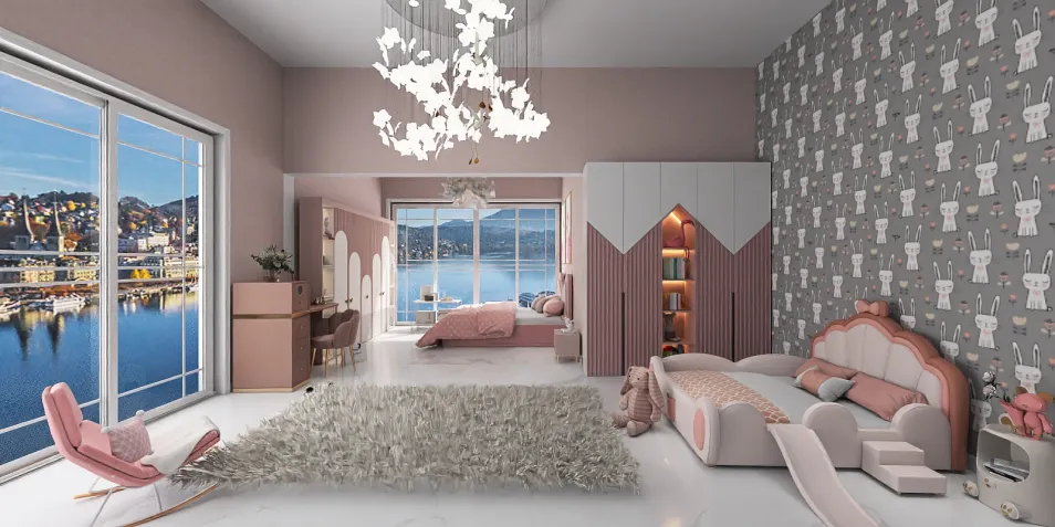Um quarto que respira serenidade, com paredes suaves e um tapete macio que convida ao descanso. A luz natural flui pelas janelas, refletindo um lago sereno. Cada detalhe, do papel de parede ao mobiliário, é um convite para sonhar e relaxar, um espaço onde a infância se eterniza.